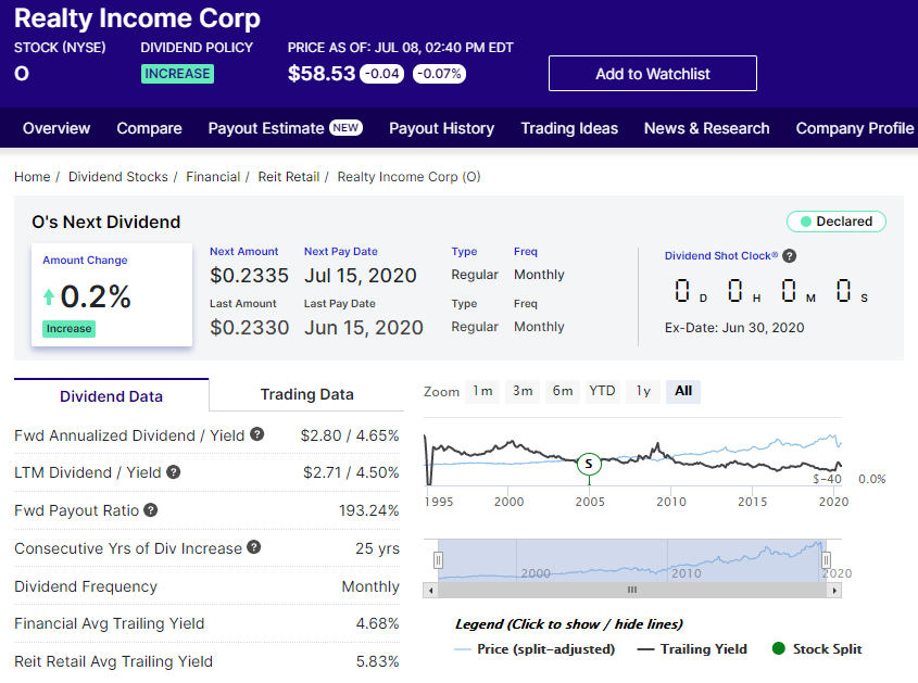 배당주를 하는 분들이 자주 사용하는 dividend.com입니다. 이곳에서 티커(예를 들어 스타벅스의 티커 : SBUX)를 검색하면 해당 주식의 배당률, 배당 기간 등 다양한 정보를 얻을 수 있는데요. 한번 티커 O(리얼티 인컴)을 검색해볼까요?